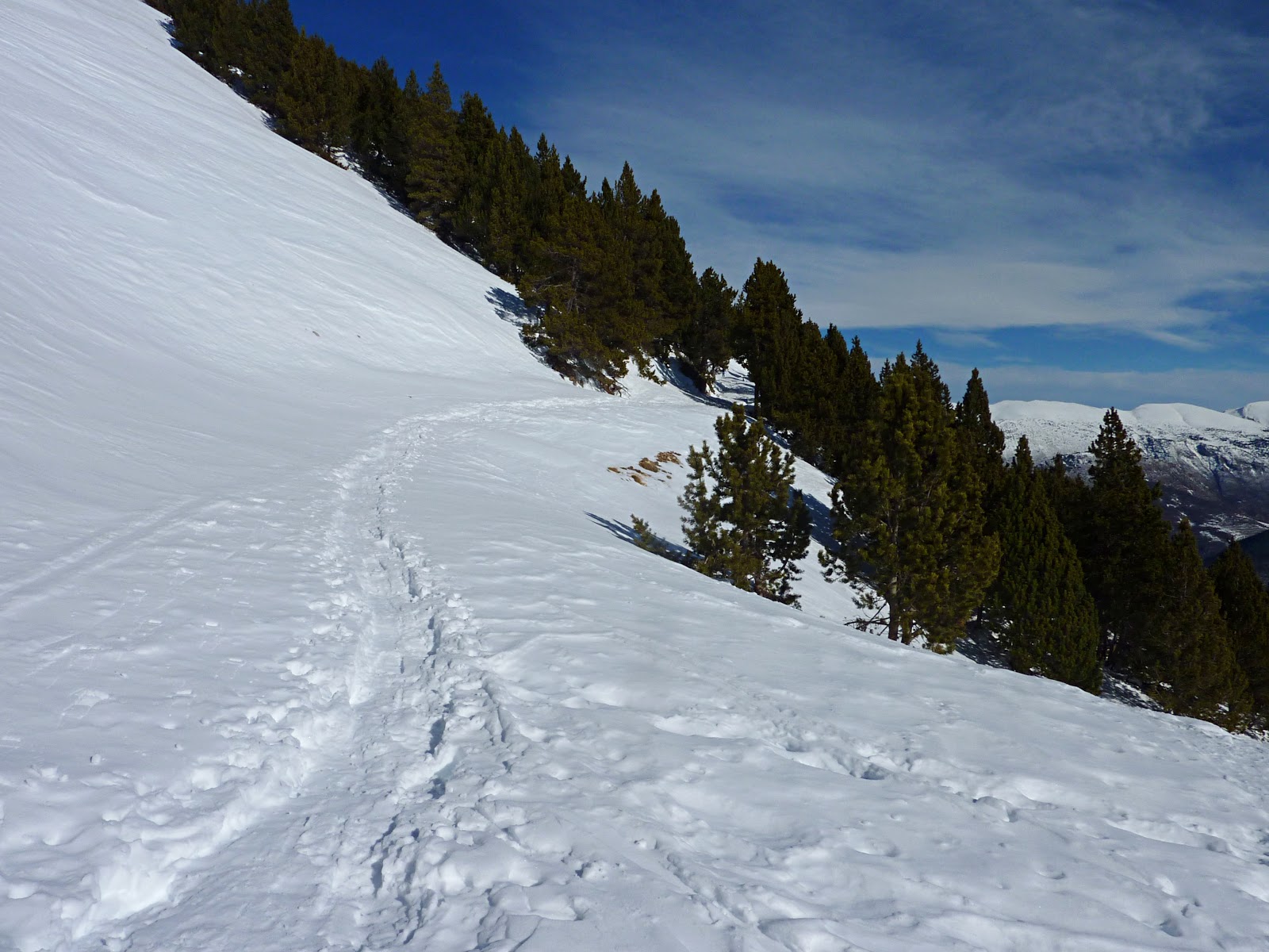 La pista és molt suau, quasi no té pendent, més de 3 kilòmetres des de l'inici a Estivella fins a la cruïlla a mà esquerra per anar al Pedró (per on vàrem agafar fa unes setmanes amb la Teresa) per pujar 220 metres de desnivell. Avui a l'arribar a la cota 2157 en lloc d'agafar a mà esquerra continuo a la dreta, després de fer un franqueig arribo a la Pleta del Diable (2178 mts.), pujo uns metres i per dins del bosc inicio un franqueig donant la volta a tota la muntanya, surto al costat del Teleesquí dels Carbassers (avui tancat) i començo a pujar amb ganes fins a assolir el cim del Tossal d'Estivella (2338 mts.), he pogut arribar amb els esquís als peus fins al mateix cim.