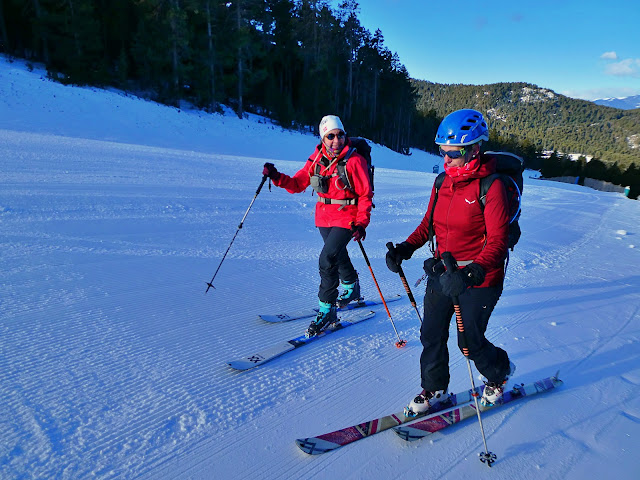 Al fer una tarda magnífica, decidim pujar uns dos-cents metres més i així arribem al cotxe amb els mateixos esquís. Dit i fet, arribem a la cota 1700, traiem pells i baixem per la fàcil pista "Familiar" fins al mateix cotxe. Moltes gràcies Carme i Teresa per venir una vegada més, sobretot aquesta sortida que serà l'última meva fins d'aquí a un temps (espero que sigui poc temps).