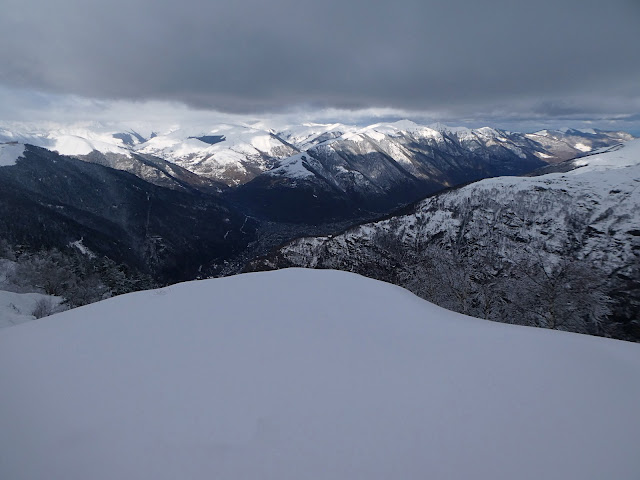 Des d'aquí dalt tenim una magnífica vista de l'estació de Superbagneres i del poble de Luchon, però també veiem el Tuc d'Aubars just davant nostre, al mateix temps que des del coll veiem la cara oest bastant pelada, ara veiem que a la dreta hi ha una petita vall que puja fins a un coll ben a prop del cim. El dia al mateix temps sembla que es vol obrir, decidim baixar directes des del cim fins a la Cabana de Pastors (1750 mts.) al costat mateix del Col de Bàreges i posar pells per pujar per l'altre vessant.
